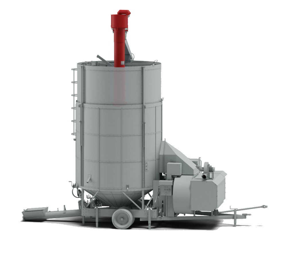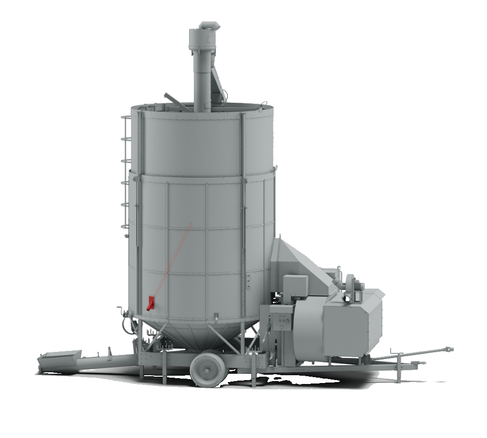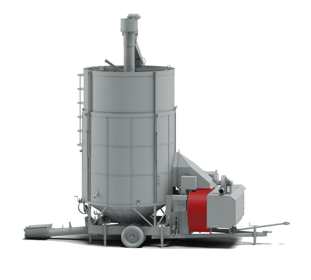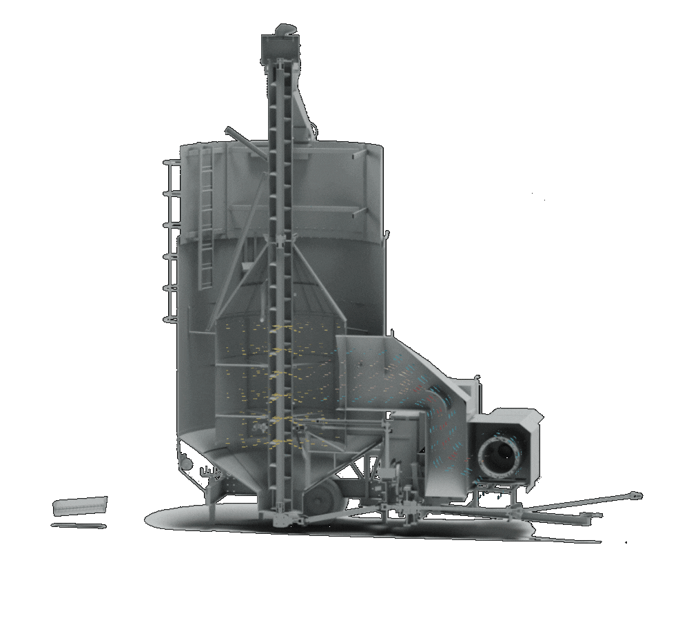 The fan draws in outside air and, through the preheated furnace, directs it into the drying chamber to reduce the moisture content of the grains.
